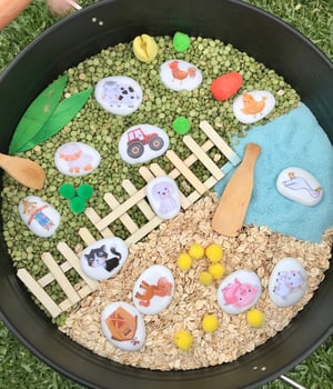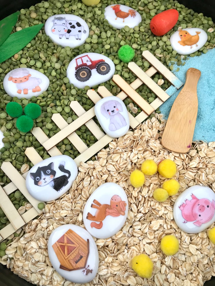 *accessories not including but you can make this yourself easily by using any things around the house and pantry like uncooked rice, pasta, chickpeas, here we used dried peas and oats to create our farm